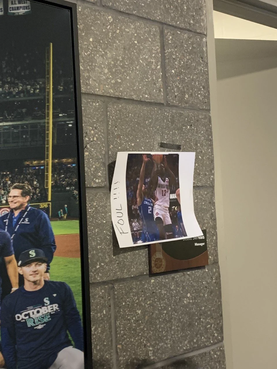 Ty France, San Diego State alumni, posted these printed out photos of San Diego State’s win in the men’s March Madness tournament (Photo by Charles Hamaker)