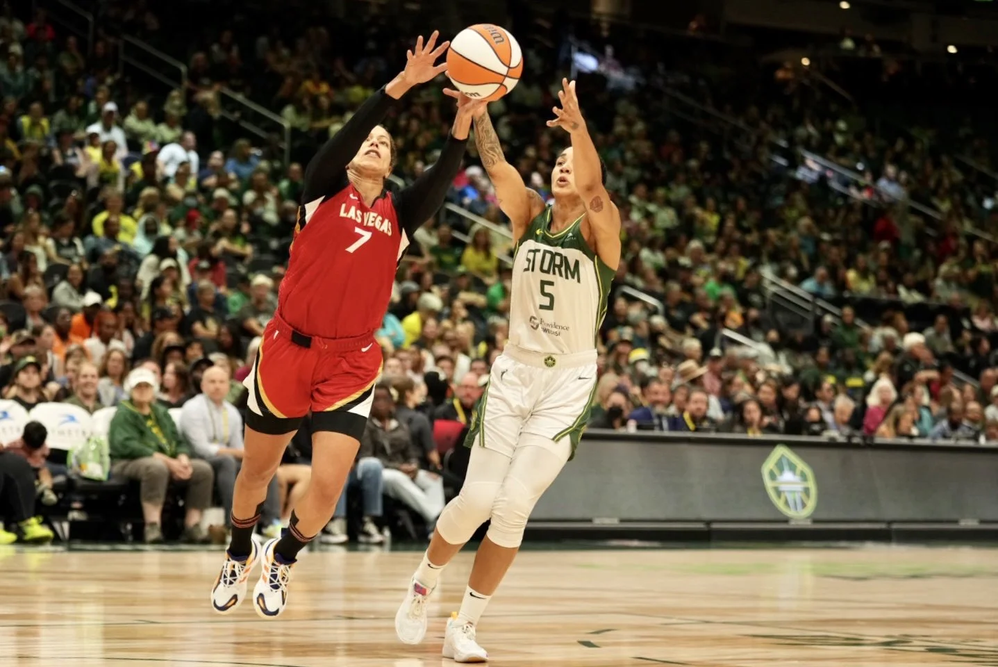 Seattle Storm forward Gabby Williams tries to go up for a shot against Las Vegas Aces guard Kelsey Plum during the teams’ July 20th, 2023 matchup (Photo by Anthony May)