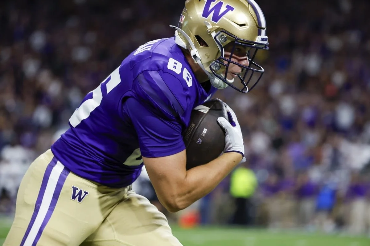 Washington Husky tight end Decker DeGraaf caught the only touchdown pass thrown by quarterback Will Rogers in the game, a 33-yard completion. (Photo by Joe Nicholson/USA Today sports)