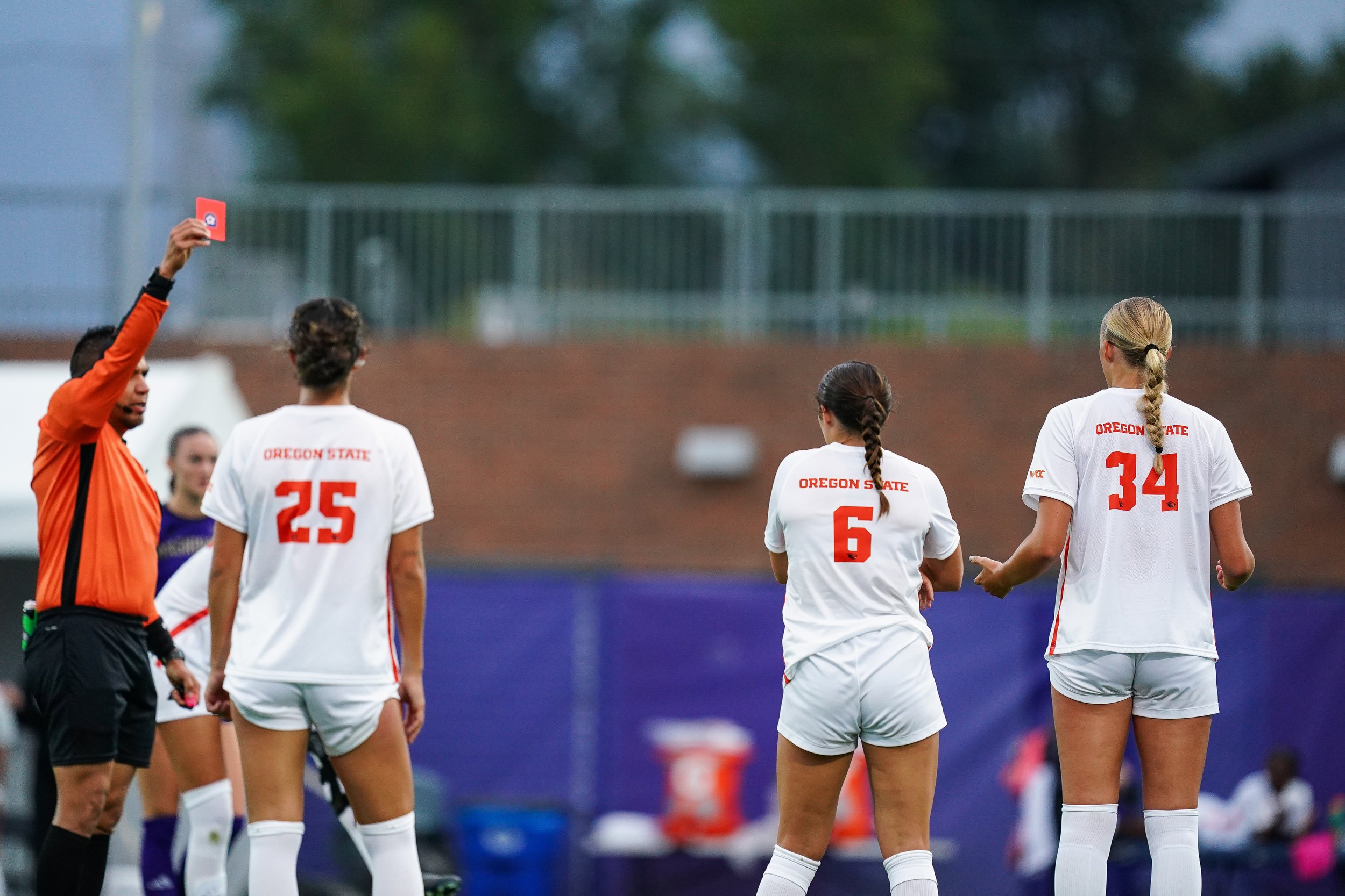 The Huskies only scored two goals from corner kicks/throw-ins last season, so they’re already well on their way to beating that mark this season. It appeared as though Washington was going to have a golden opportunity to add a second goal in the first 45 minutes or at least greatly hinder their opponents for the rest of the match, as Beavers defender Abbi Leonard was initially shown a red card for a denied goal scoring chance, but a request for a review ruled that it was just a yellow card, and the ensuing free kick by Jadyn Holdenried was denied before her second attempt rolled harmlessly off target.