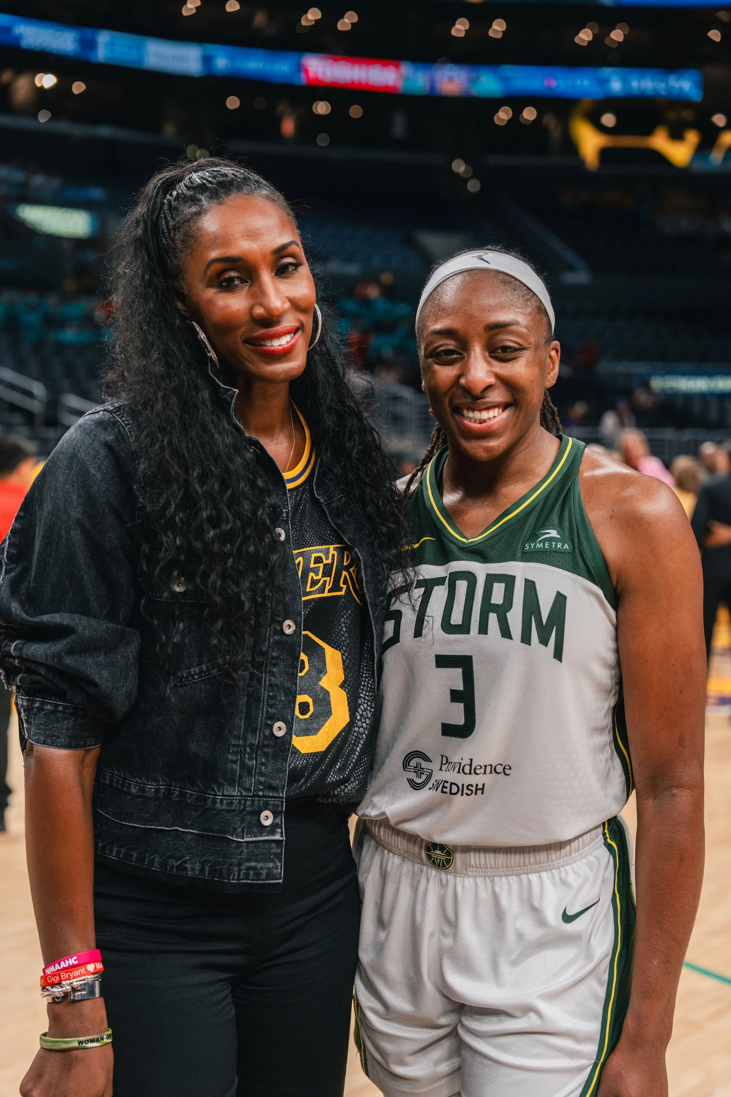 Seattle Storm forward Nneka Ogwumike with the legendary Lisa Leslie after the Storm’s 89-83 win over the Los Angeles Sparks on Tuesday, July 16th, at Crypto.Com Arena. (Photo via the Seattle Storm)