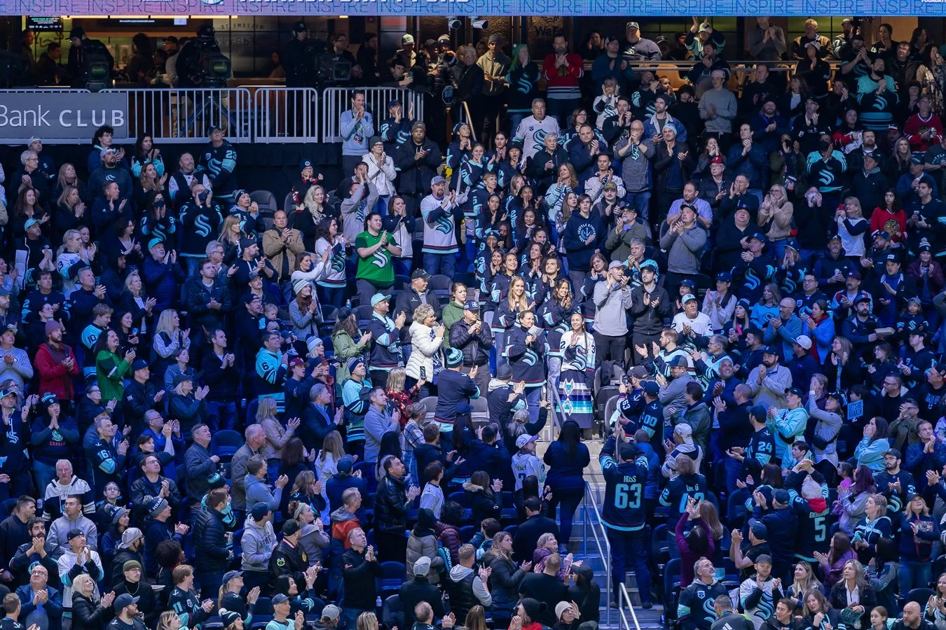 Seattle 1st and 2nd stars of the night Jamie Oleksiak and Jared McCann skate off the ice after Yeeting the Fish, while Philipp Grubauer (Relieved Martin Jones, injury) skates off the ice after the win (Photos by Mathew Bermudez)