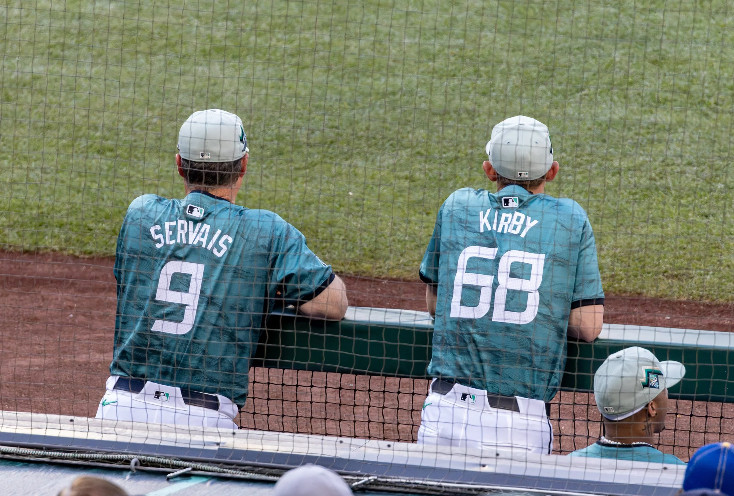 Seattle Mariners manager Scott Servais and starting pitcher George Kirby in the dugout following Kirby’s outing (Photo by Mathew Bermudez)