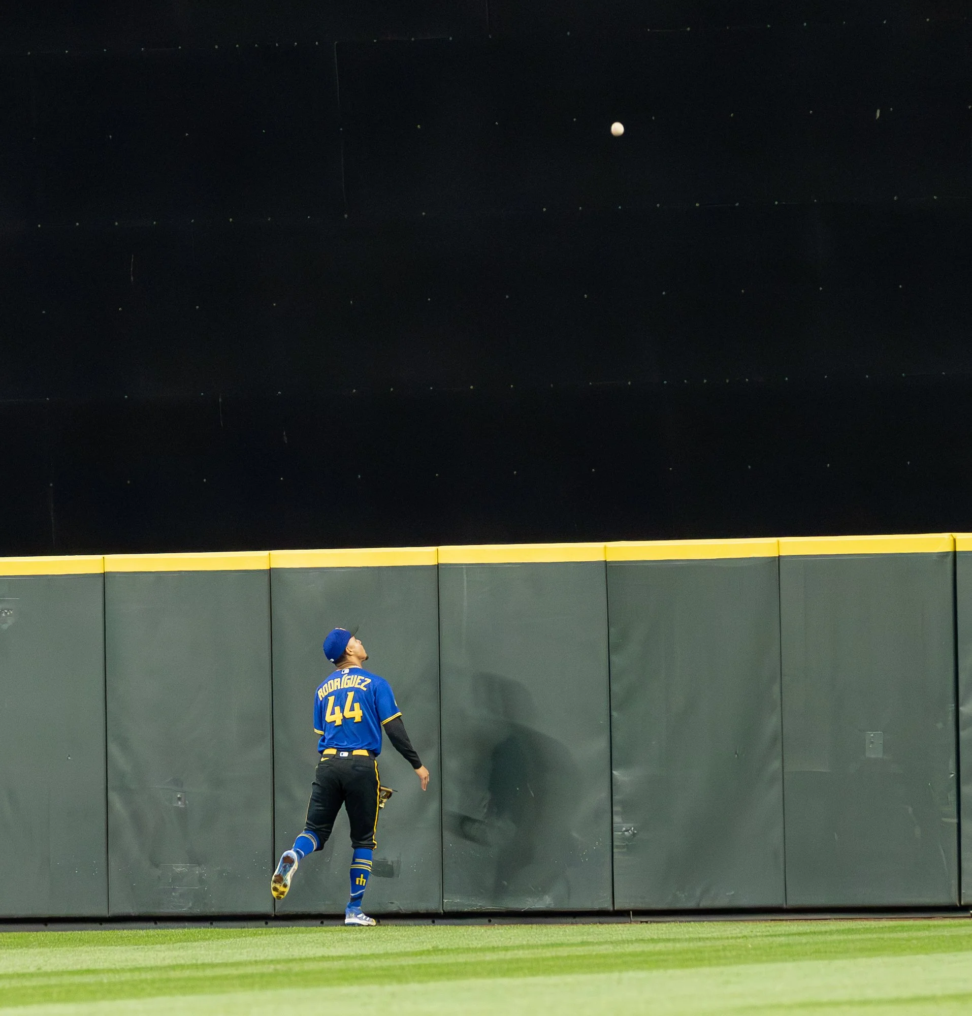 Seattle Mariners center fielder Julio Rodriguez watches the ball sail over the outfield fence on Kyle Tucker’s home run to give Houston the lead (Photo by Mathew Bermudez)