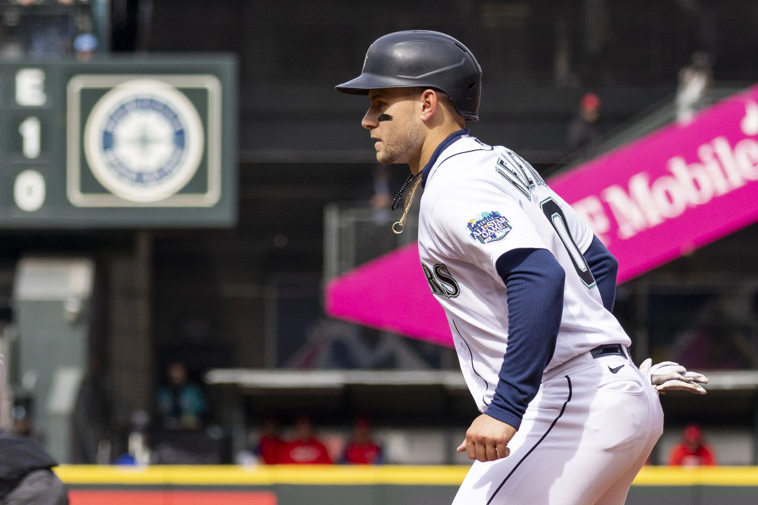 Seattle left fielder Jarred Kelenic homered in all three games of the Cubs series (Photo by Liz Wolter from the series finale against the Angels on 4/5/2023)