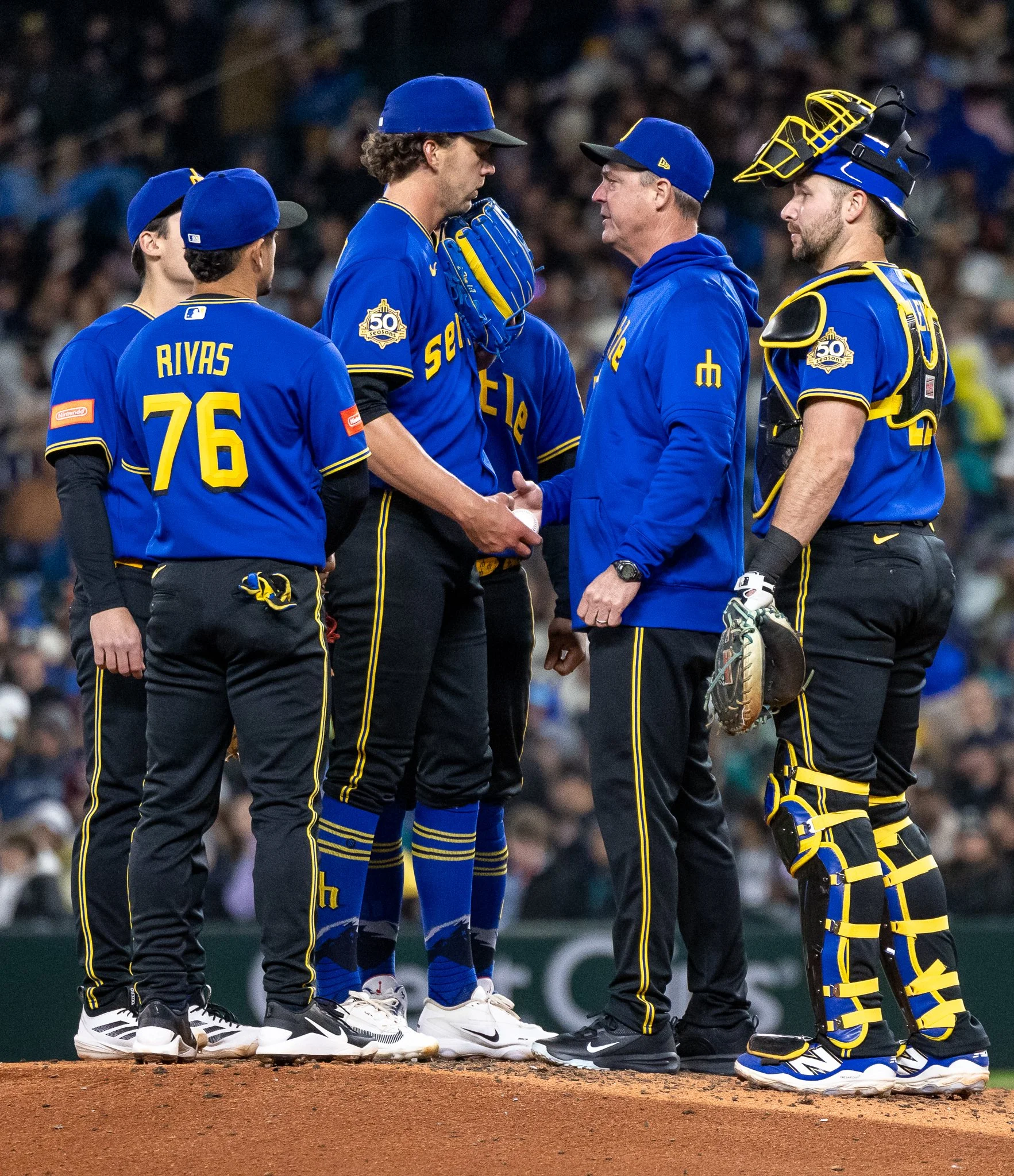 The Seattle Mariners infield, catcher Cal Raleigh, and manager Dan Wilson surround starting pitcher Logan Gilbert during a mound visit, as the team hosted the Texas Rangers at T-Mobile Park on Friday, April 17th, 2026. (Photo by Andy Glass for Circling Seattle Sports)
