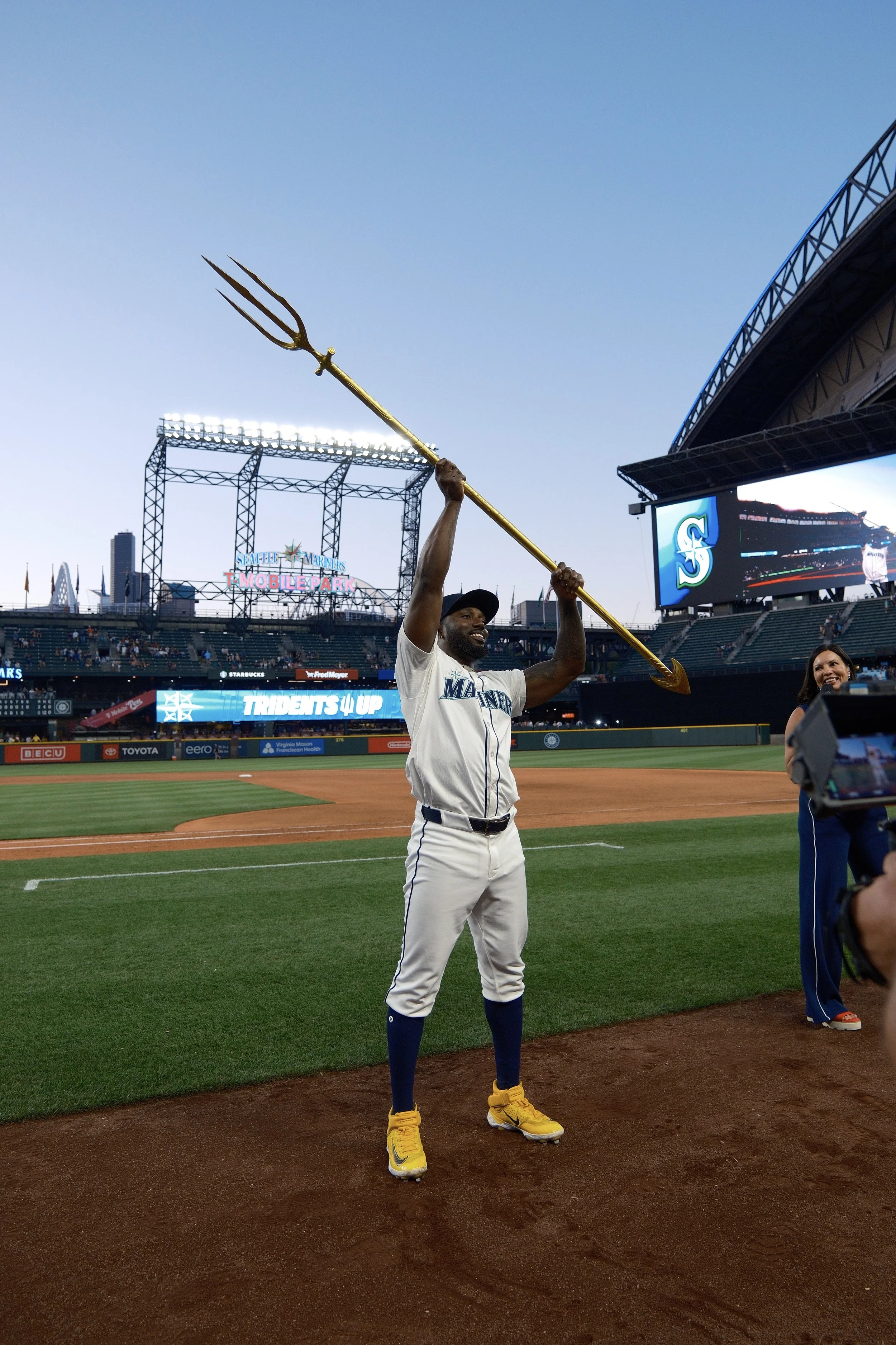 Seattle Mariners left fielder Randy Arozarena hoists the teams home run trident following his postgame interview as the team opened a four-game home series against the Kansas City Royals with a 6-2 victory on Monday, June 30th, 2025 at T-Mobile Park. (Photo by Eric Hiller for Circling Seattle Sports)