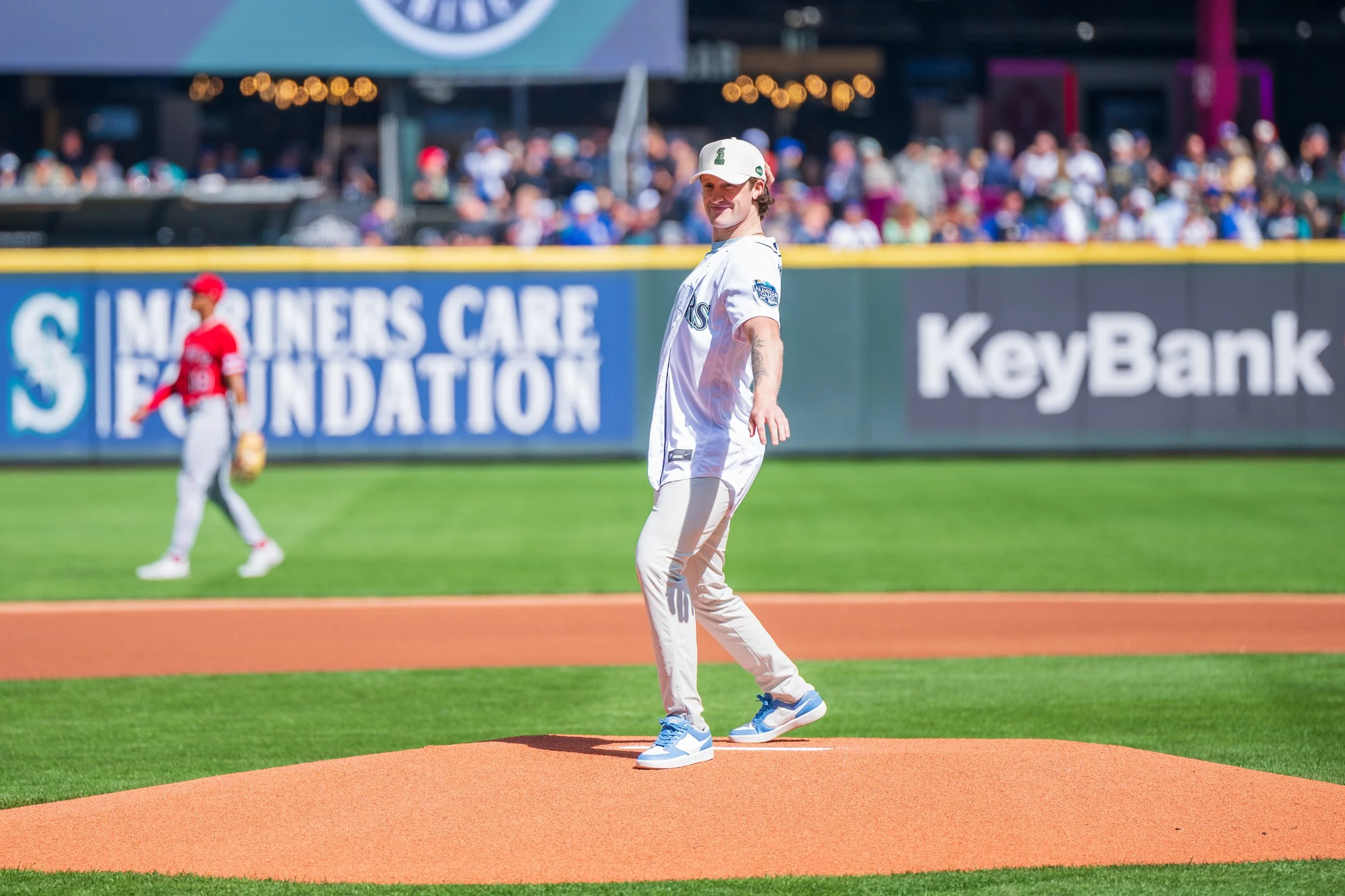 Seattle Kraken forward Jared McCann threw out the ceremonial first pitch ahead of the Seattle Mariners win over the Los Angeles Angels (Photo by Bryan Saldana)