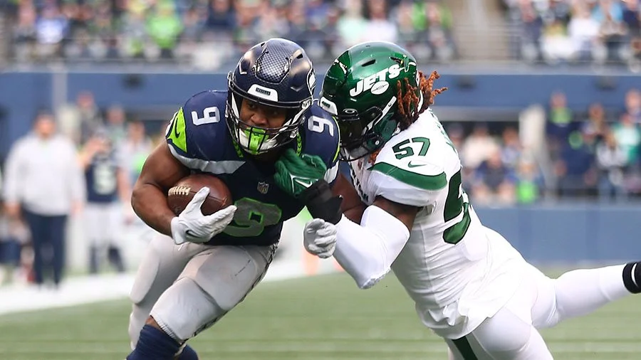Kenneth Walker III looks to shake off a tackle against the Jets (Photo by Lindsey Wasson)