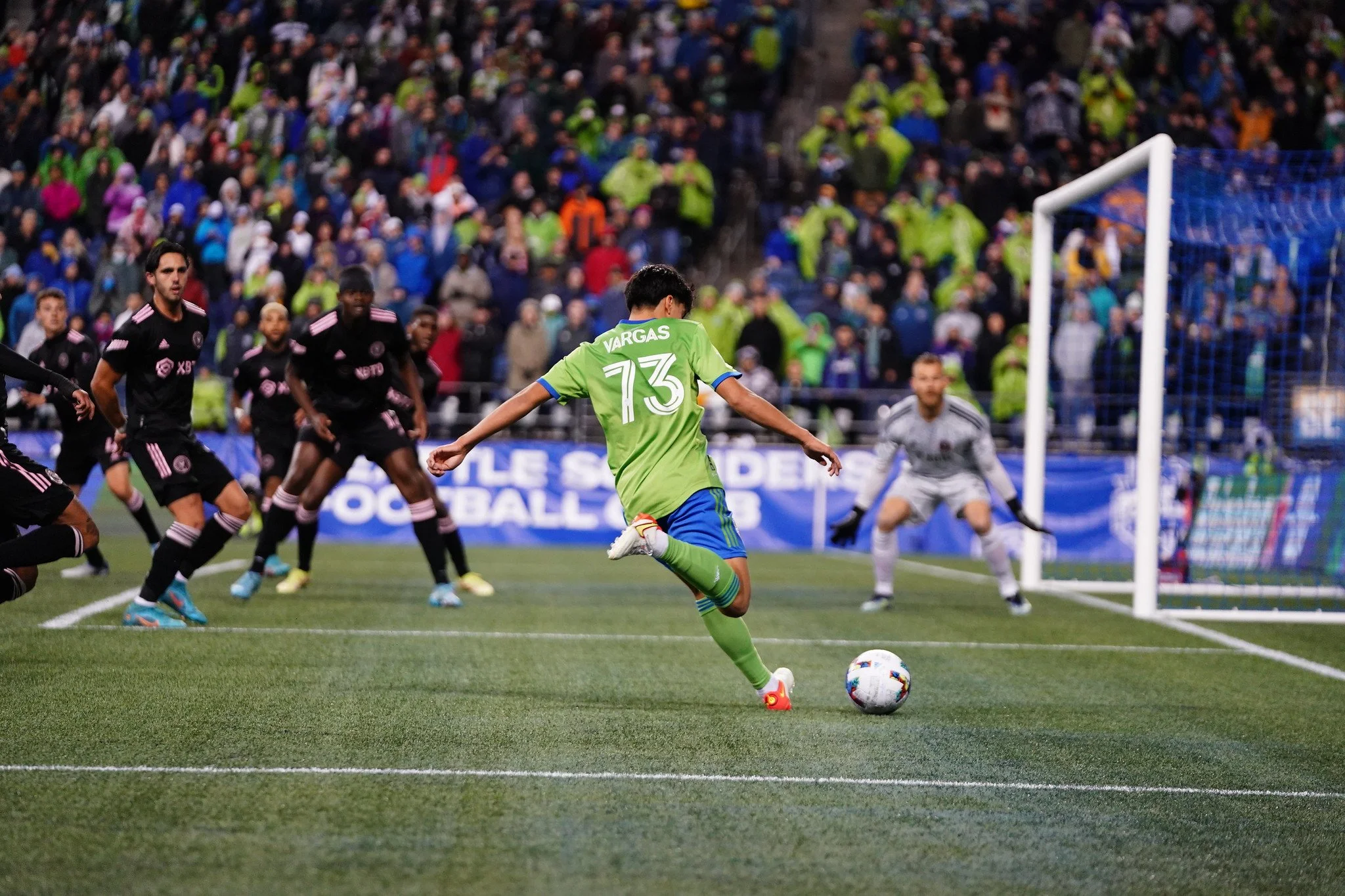Obed Vargas looks to make a cross against Inter Miami (Photo by Mike Fiechtner)