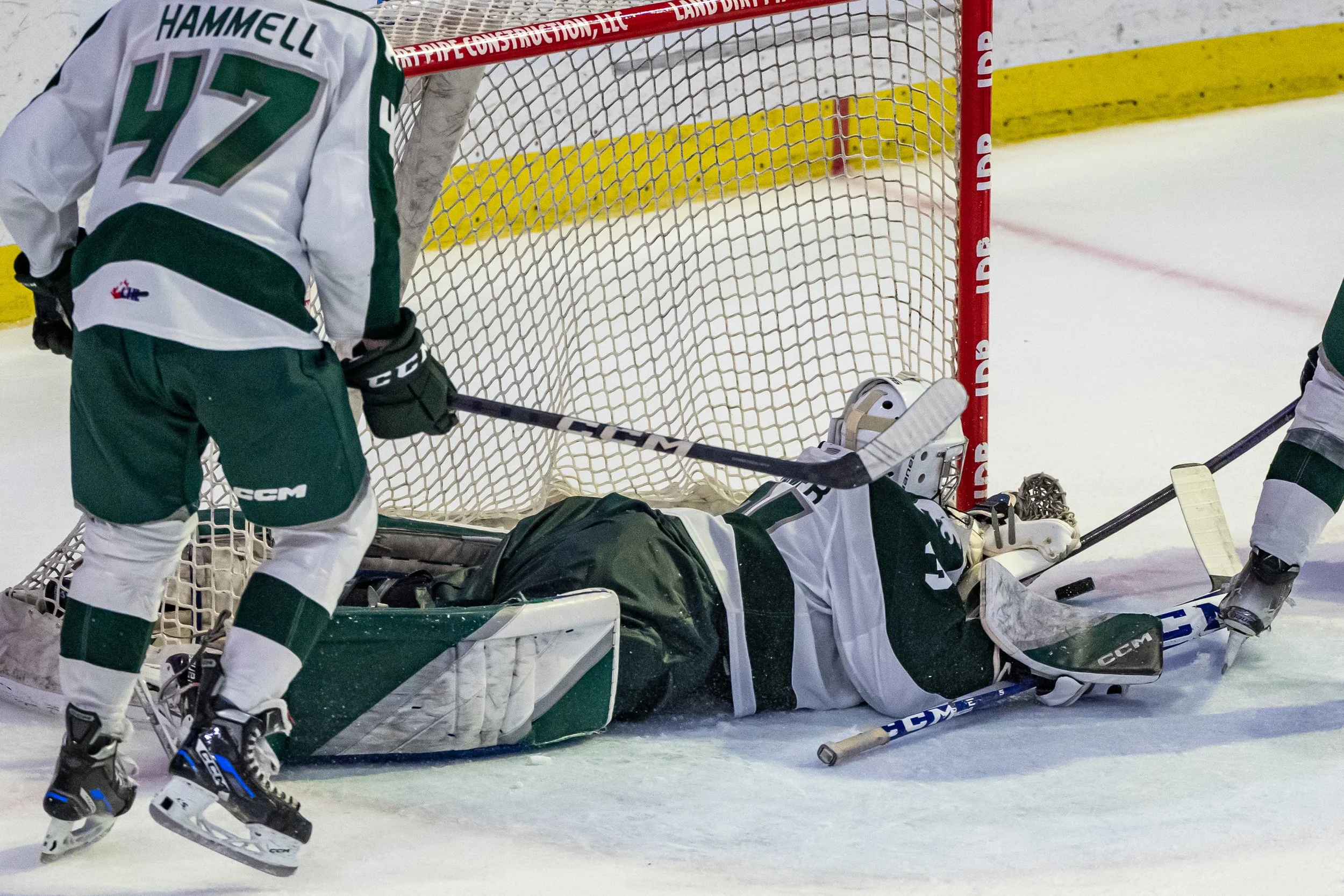 Silvertips goaltender Tyler Palmer lays out in an effort to cover the puck (Photo by Liv Lyons)