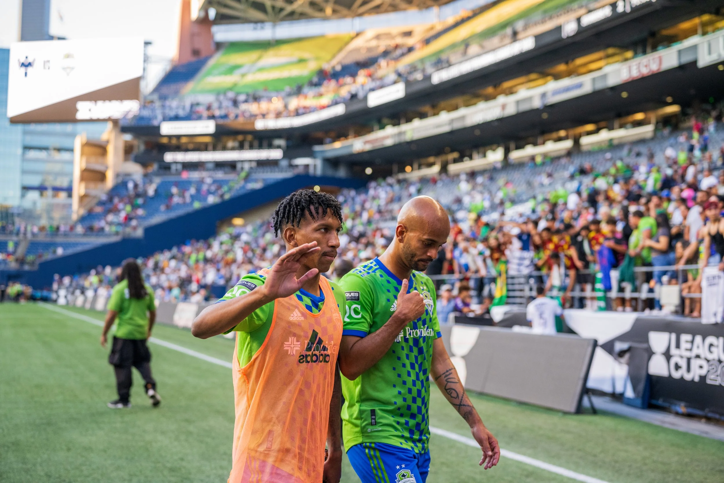 Seattle Sounders FC forwards Leo Chu and Heber leave the pitch after the loss to Monterrey (Photo by Bryan Saldana)