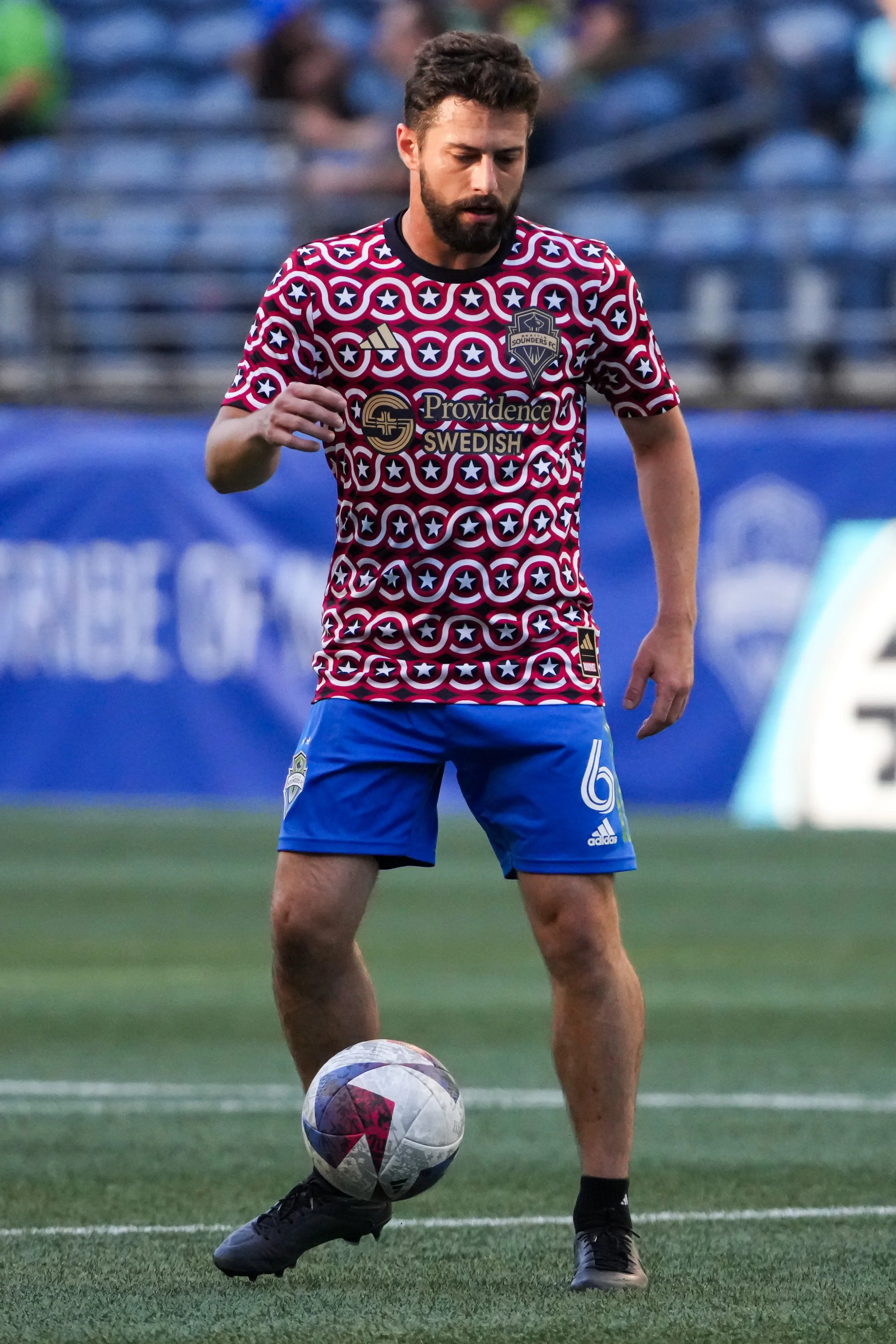 In warmups, the Sounders wore their MLS x Marvel collaboration tops, themed around superhero Captain America (Photo by Liv Lyons)