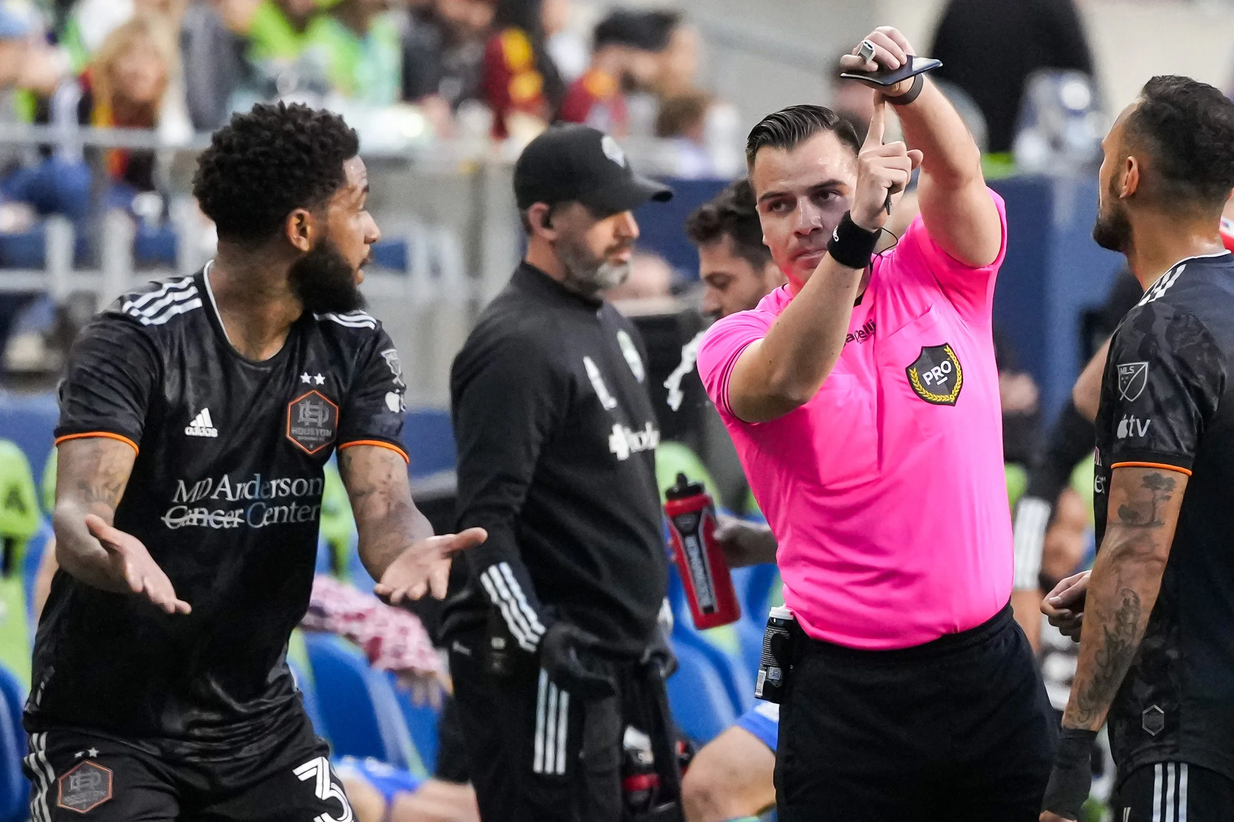 Head referee Rosendo Mendoza sends off Houston Dynamo’s Micael with his second yellow card of the night, resulting in a red card (Photo by Liv Lyons)