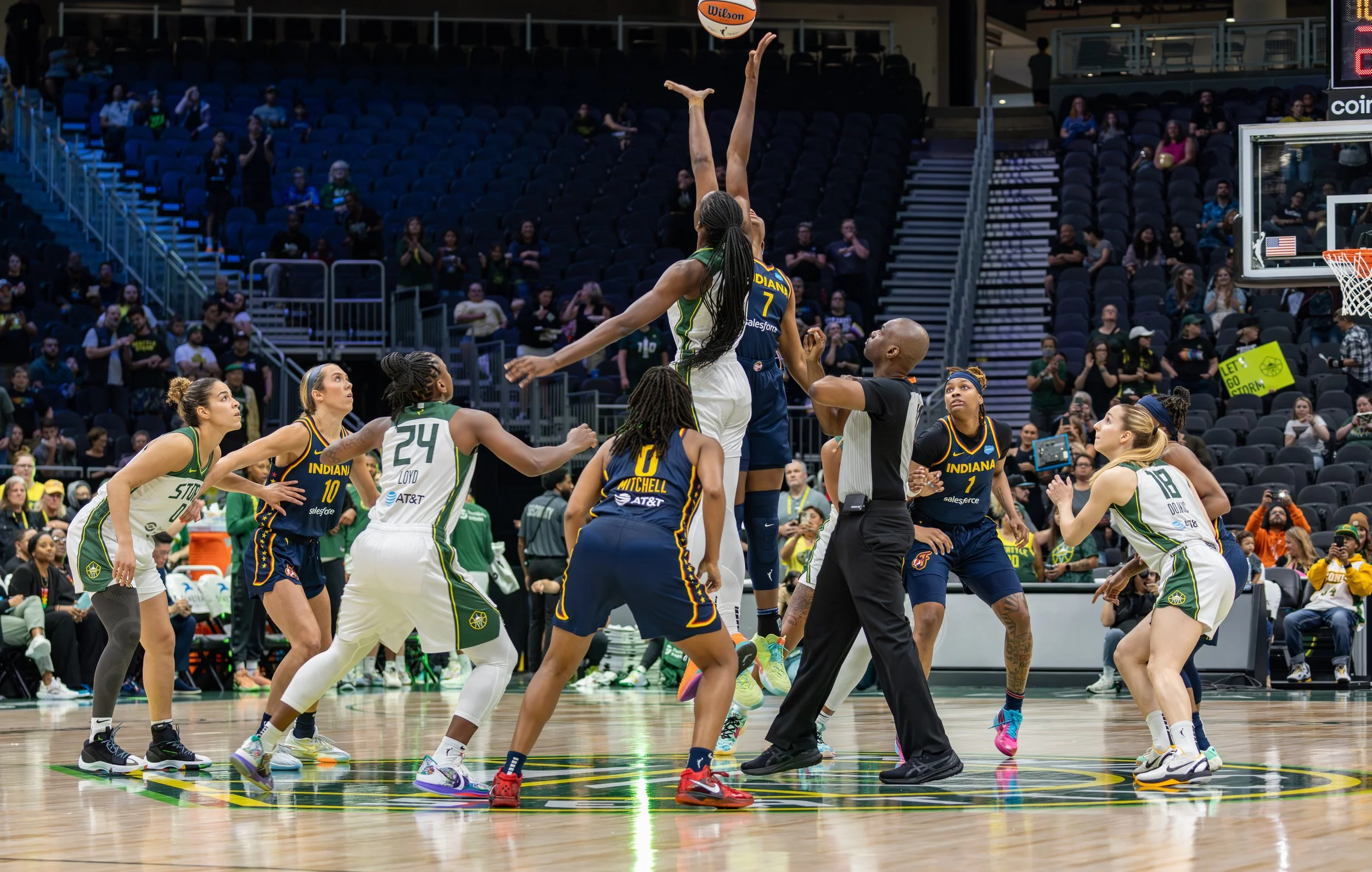 Opening tipoff between the Indiana Fever and the Seattle Storm for their June 22nd, 2023 matchup inside of Climate Pledge Arena (Photo by Mathew Bermudez)