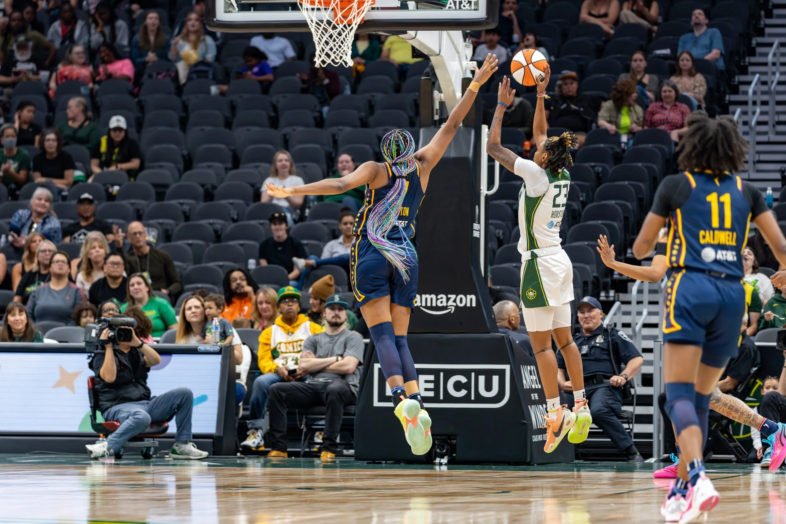 Seattle Storm forward Jordan Horston goes up for a shot while Indiana Fever forward Aliyah Boston attempts to block it (Photo by Mathew Bermudez)