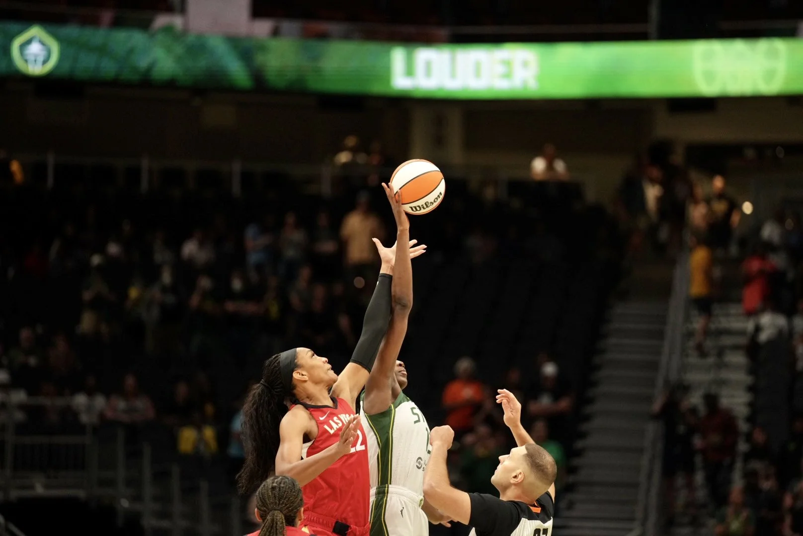 Opening tipoff between A’ja Wilson of the Las Vegas Aces and Ezi Magbegor of the Seattle Storm (Photo by Anthony May)