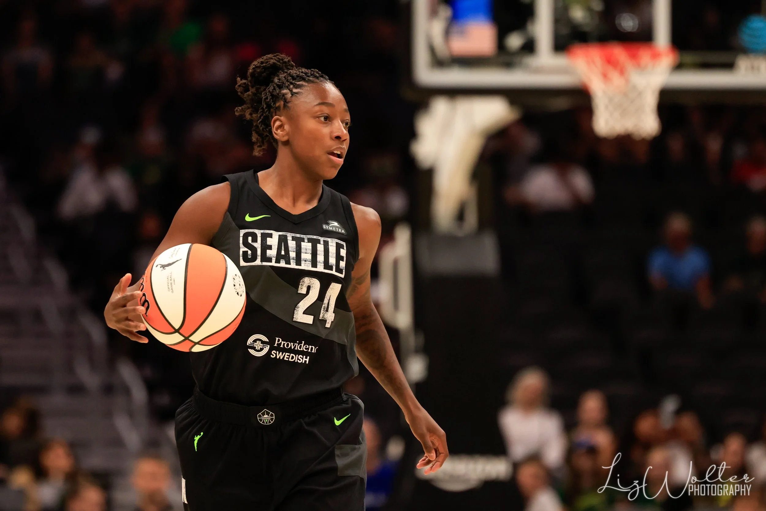Seattle Storm shooting guard brings the ball up the court during the teams loss to the Chicago Sky on July 23rd, 2023 (Photo by Liz Wolter)