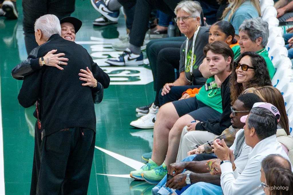 Retired Seattle Reign FC and USWNT forward Megan Rapinoe hugs Seatle SuperSonics legend Lenny Wilkens courtside, as Rapinoe's partner and Seattle Storm legend Sue Bird and Seattle Seahawks wideout DK Metcalf look on. (Photo by Nate Koppelman)
