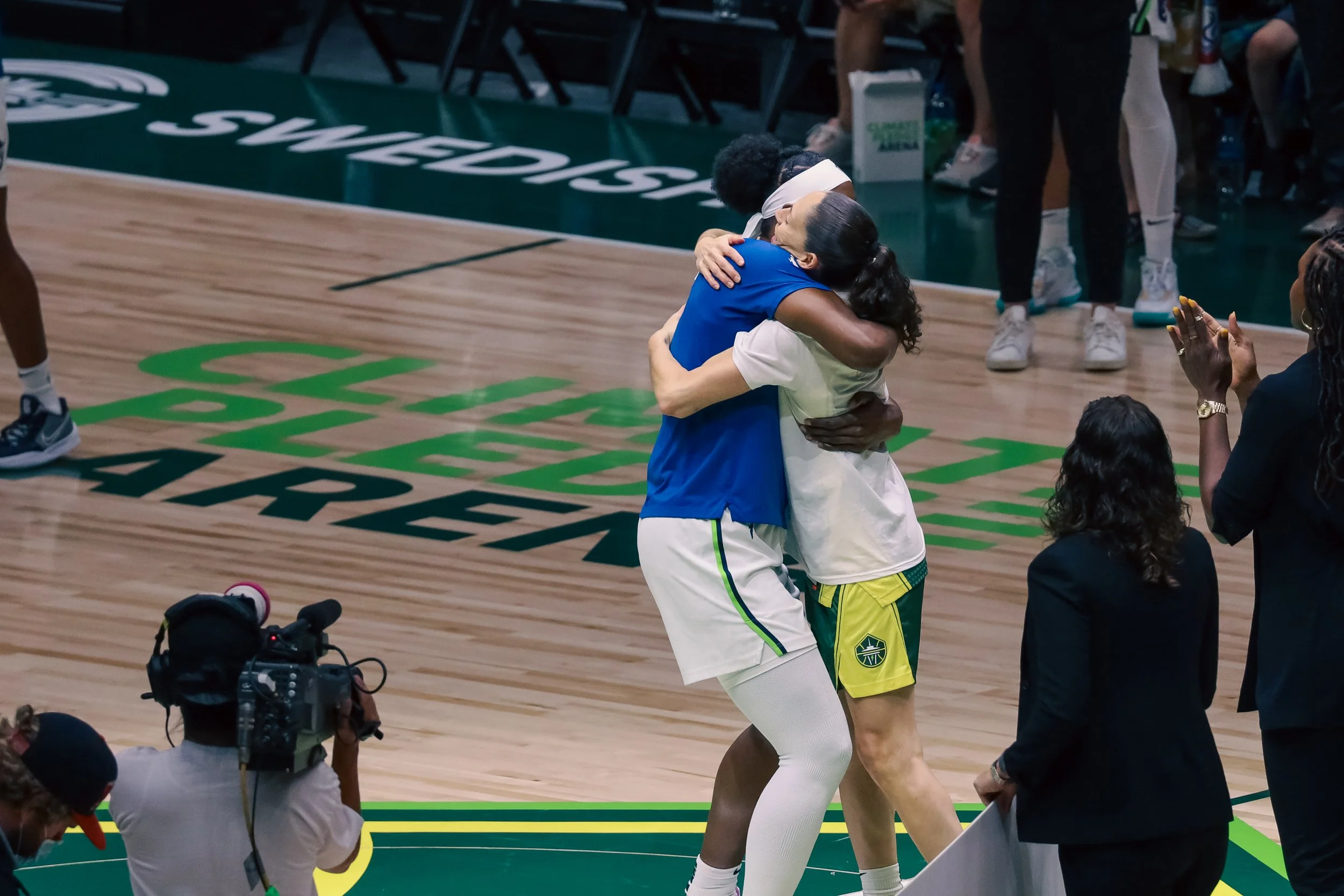 Sylvia Fowles and Sue Bird embrace pregame (Photo by Mathew Bermudez)