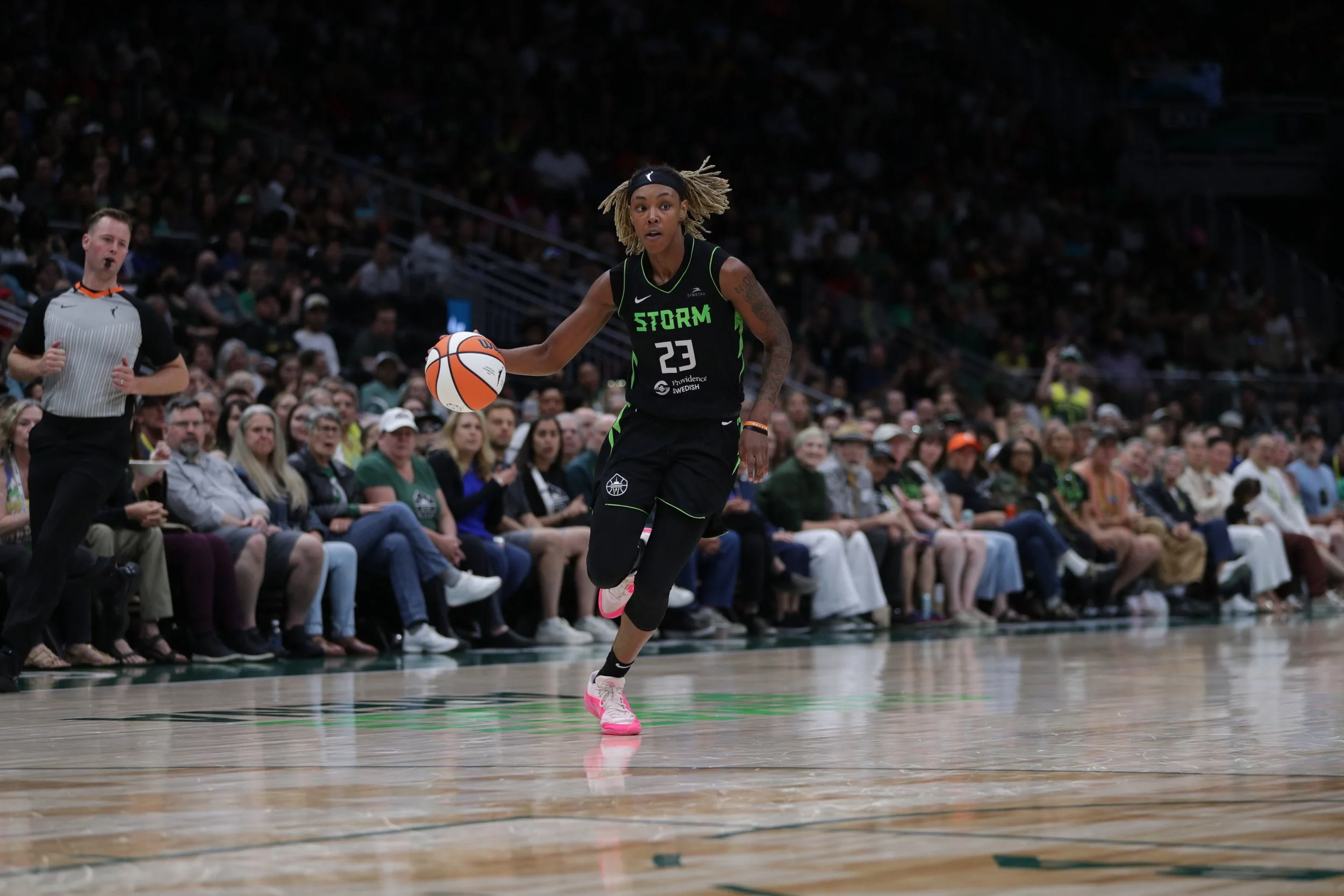 Storm forward Jordan Horston attacking the fastbreak against the Chicago Sky on July 5th at Climate Pledge Arena in Seattle, WA. (Photo by Rio Giancarlo)