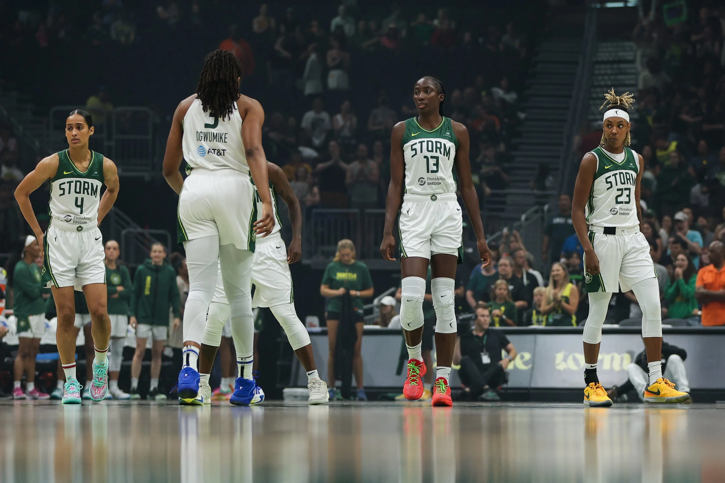 Storm players Skylar Diggins-Smith Nneka Ogwumike, Jewell Loyd, Ezi Magbegor, and Jordan Horston against the Atlanta Dream at Climate Pledge Arena on July 14, 2024. (Photo by Rio Giancarlo)