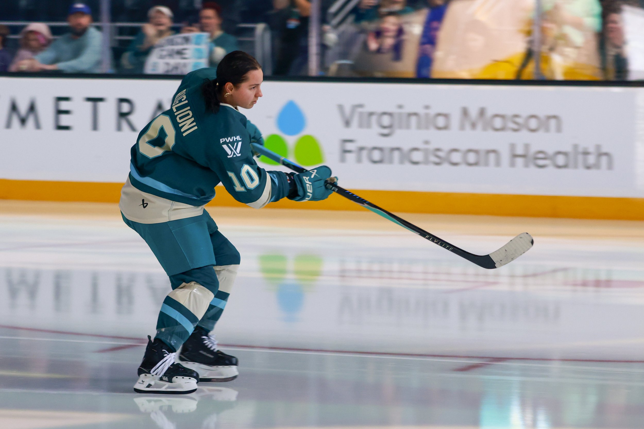 Seattle Torrent rookie forward Jenna Buglioni during warmups of the teams inaugural home opener against the Minnesota Frost on Friday, November 28th, 2025 at Climate Pledge Arena. (Photo by Liz Wolter for Circling Seattle Sports)