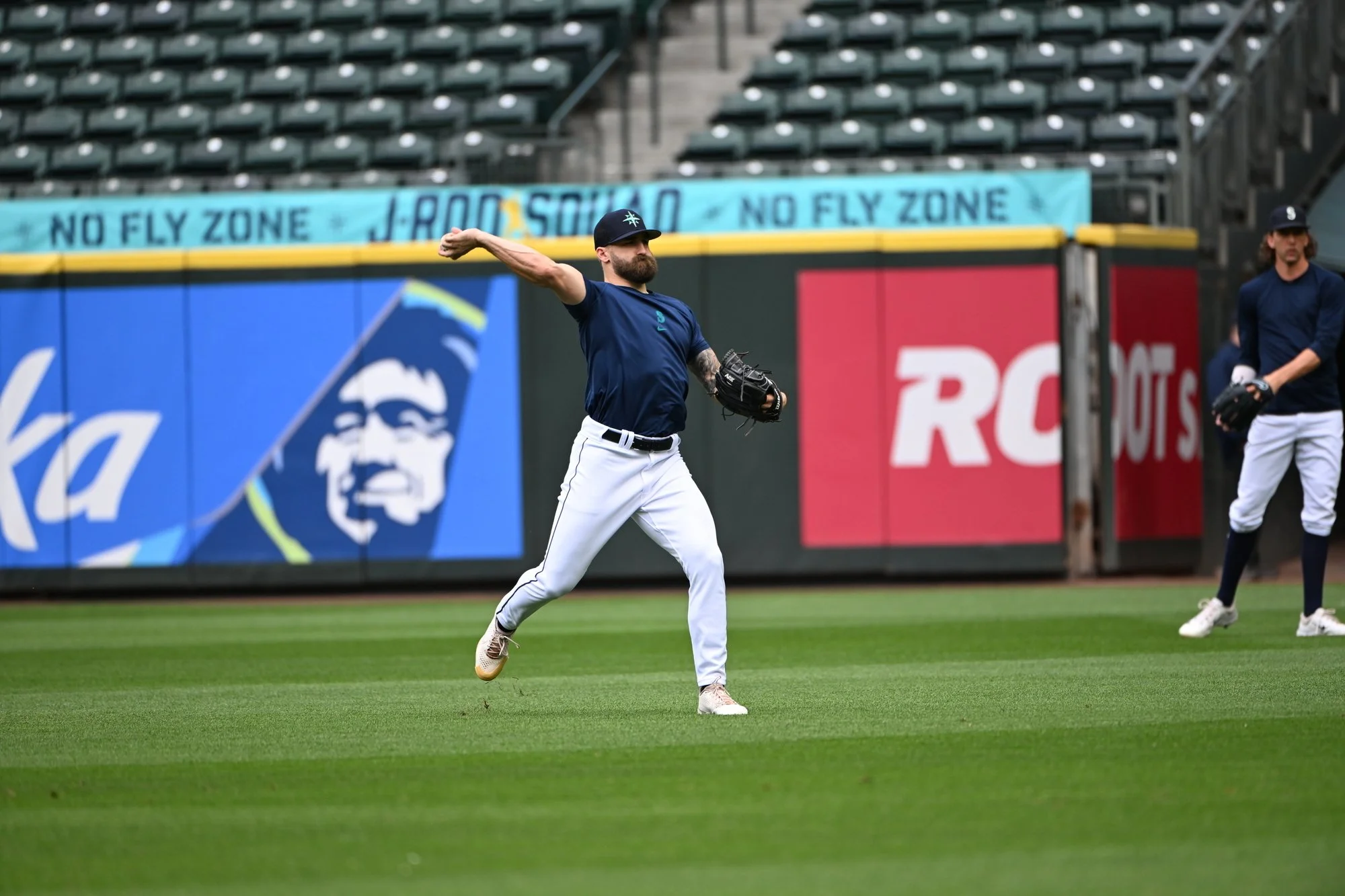 Seattle Mariners relief pitcher Ty Adcock plays catch ahead of the Mariners game against the Miami Marlins on June 14th, 2022 (Photo by Chris Lu)