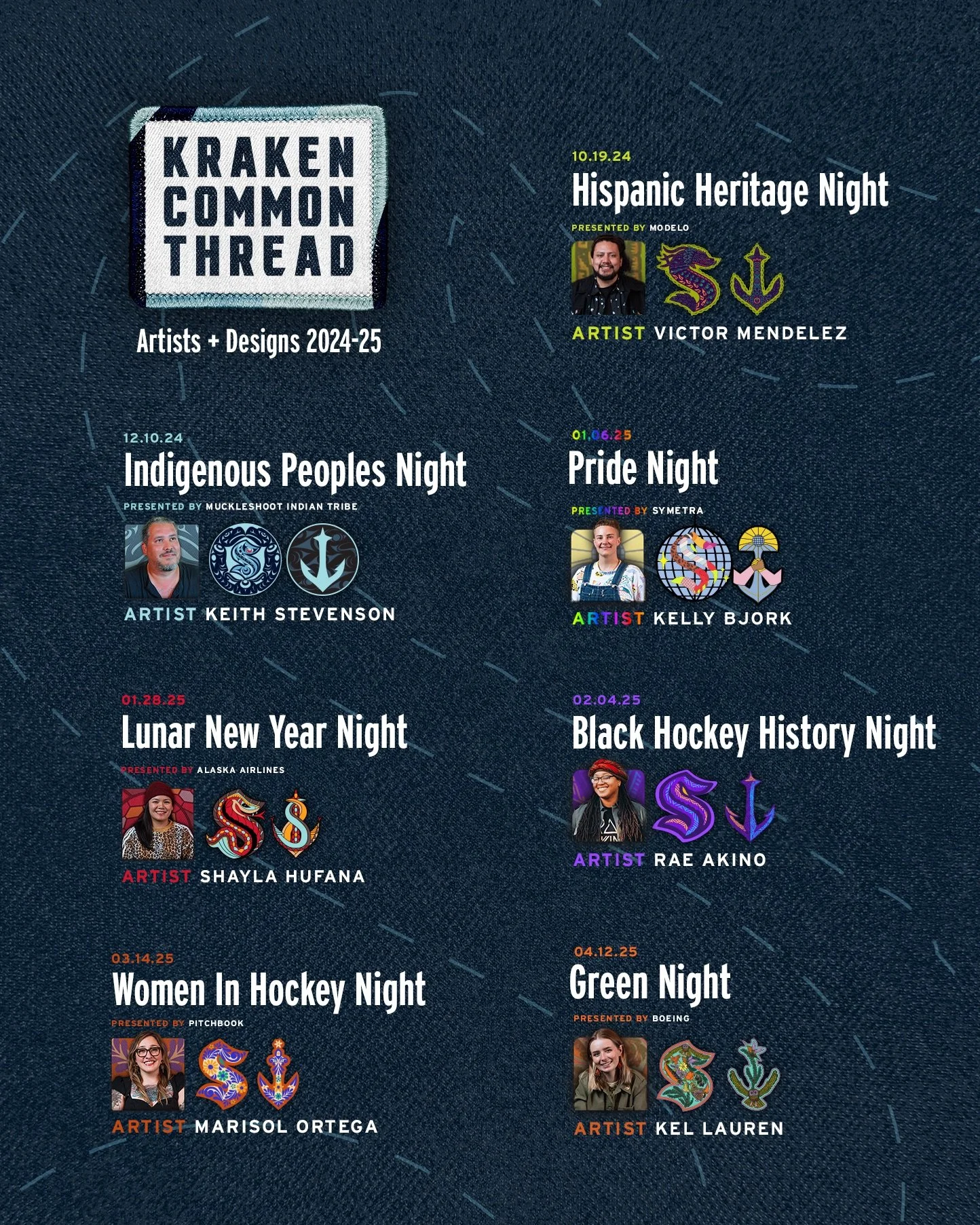 Aunque la mayoría de la comunidad latina en Washington vive, trabaja y prospera en el centro de Washington, casi 260,000 latinos viven en el condado de King y constituyen el tercer grupo racial/étnico más grande de Seattle. El Mes de la Herencia Hispana, reconocido a nivel nacional del 15 de septiembre al 15 de octubre, dará inicio a la campaña Common Thread de los Kraken, una evolución del programa Hockey is for Everyone de la NHL y la NHLPA con un mayor enfoque en la comunidad local de hockey de Seattle. Las noches Common Thread de los Kraken destacan nueve comunidades involucradas en el equipo a través de noches de juegos especiales durante la temporada 2024-25, además tendrán productos adicionales diseñados por un artista local que forma parte de esa comunidad.